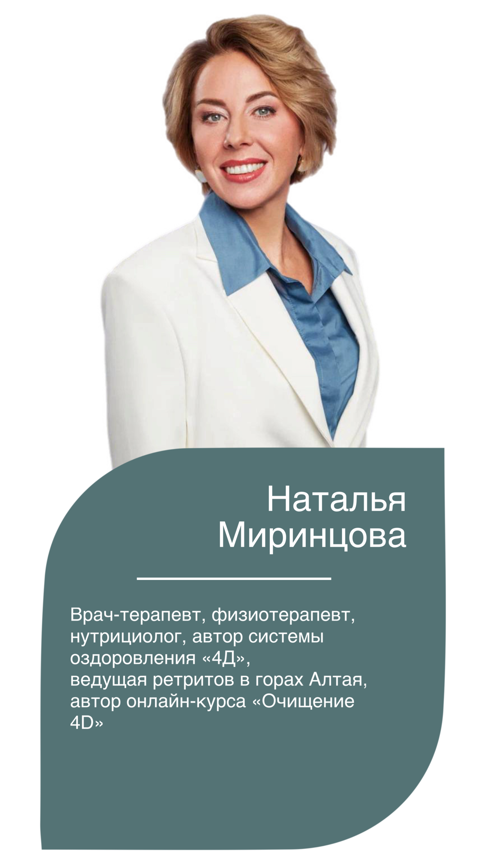 Врач-терапевт, физиотерапевт, нутрициолог, автор системы оздоровления «4D» Наталья Миринцова